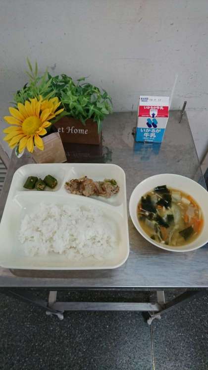 豚肉の甘辛焼き、味噌汁、オクラのおかかいため