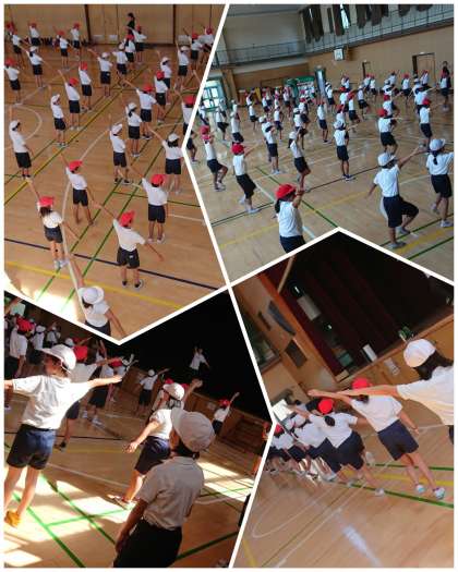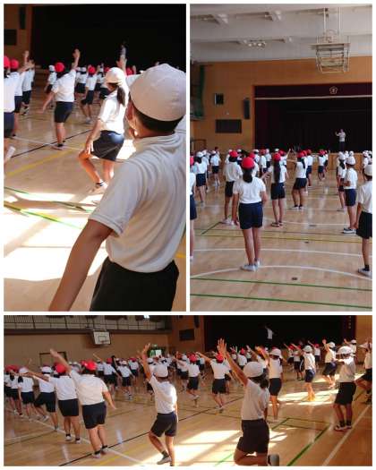 腰を低く落としたり、腕をぴんと伸ばしたりテンポの速い音楽に合わせて踊りの練習をしています。