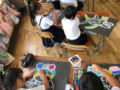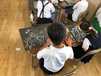 3年生は作品展に向けて、生き物の王様を想像して、「生き物キング」を書いています。アクリル絵の具で線を描いたあと、パステルで塗り込むように丁寧に描いていきます。