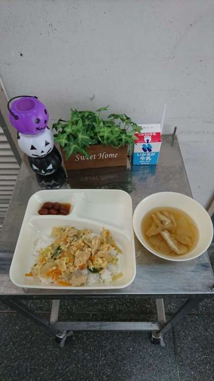 親子丼、とうがんのすまし汁、金時豆の煮物