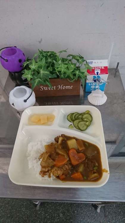 ビーフカレーライス(米粉)、きゅうりのピクルス、白桃(カット缶)