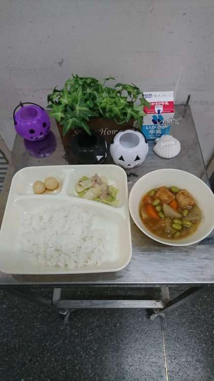鶏肉とさといもの煮物、豚肉とキャベツのいためもの、みたらしだんご