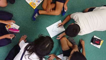 リズムにのって体を動かしたり、イラストを描きながら取り組んだりしながらみんな楽しそうに活動をしていました。