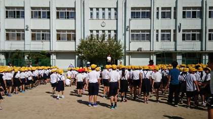 児童朝会では、時折強風が吹き、帽子が飛ばされそうになりながらも校長先生の話を聞いていました。