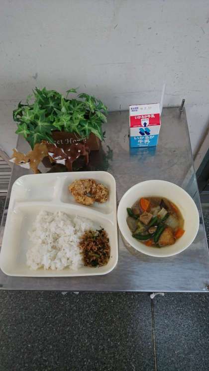 鶏肉のたつたあげ、あつあげと野菜の煮物、おかか菜っ葉