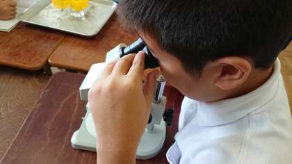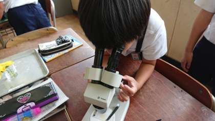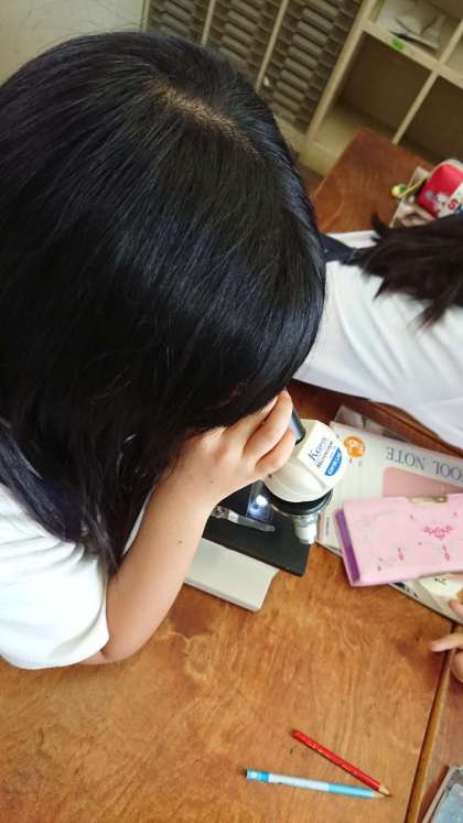 おしべの先についている花粉を双眼実体顕微鏡で観察をしました。1学期で学習して使用した顕微鏡の使い方を生かして実験をすることができていました。