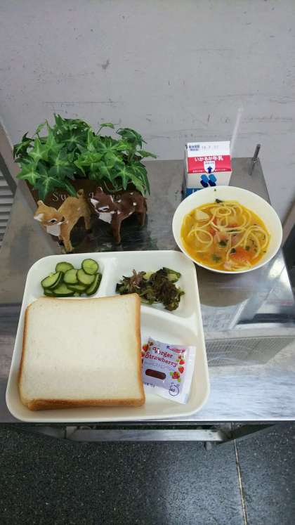 牛肉のカレー風味焼き、トマトのスープスパゲティ、きゅうりのサラダ