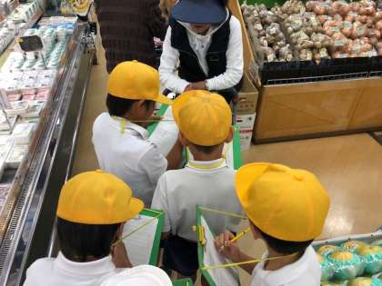 それぞれ調べたいところに分かれて、売り場の工夫や商品の並べ方を考えたり、お客さんにインタビューをしたりしています。