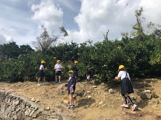 お土産のみかんを取っています。美味しそうなみかんを選んでいます。