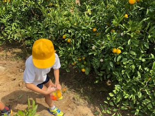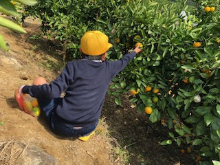 斜面を踏ん張りながら、おいしそうな黄色のみかんを取っています。