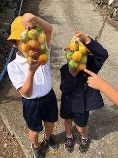 リュックに入れて、今からおやつタイム(みかん)!