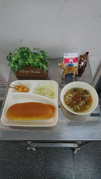 タンタンめん、キャベツの甘酢漬け、さくらんぼ(缶)