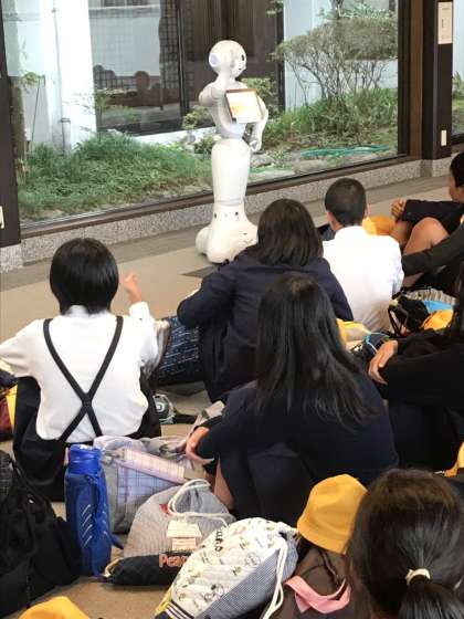 宿舎に着きました。ペッパー君がお出迎えしてくれました。