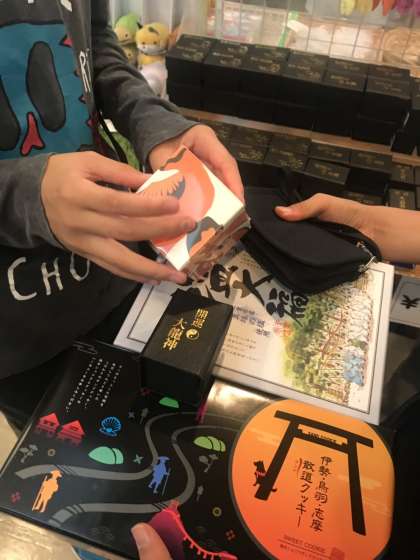 お買い物タイム。もらった人の喜ぶ顔を思い浮かべながら、お土産を選んでます。