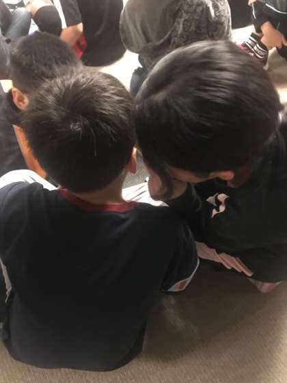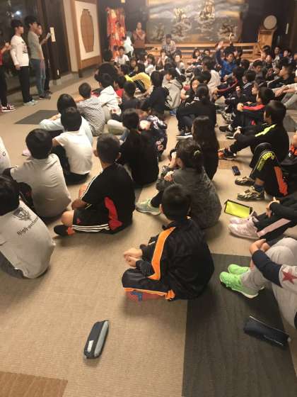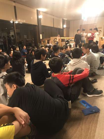 夜の集い。クイズ大会に伝言ゲームなど、楽しんでます。