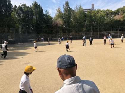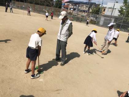 今川グランドでグランドゴルフを地域の方々に教えていただきました。
