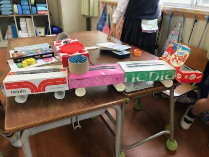 算数の学習「かたちあそび」を行いました。いろいろな形の箱や筒を組み合わせて、タワーや電車など様々なものを工夫して作りました。