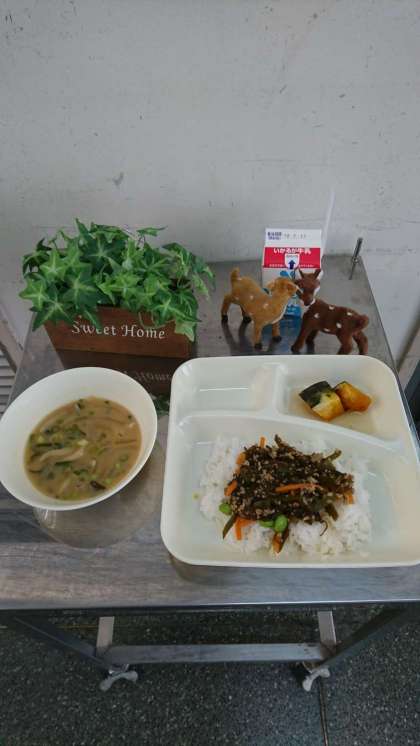 もずくと豚ひき肉のジューシー、みそ汁、焼きかぼちゃの甘みつかけ