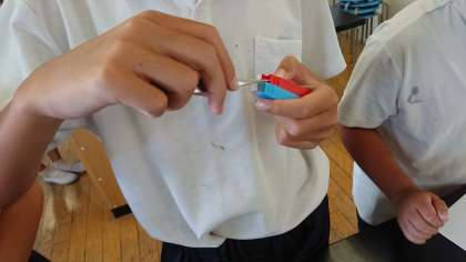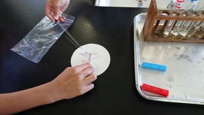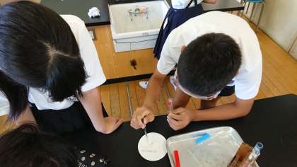 リトマス紙を使って水溶液の仲間わけをしました。初めて扱うさまざまな水溶液に緊張しつつ、ガラス棒でリトマス紙に液体をつけた時の色の変化を観察していました。