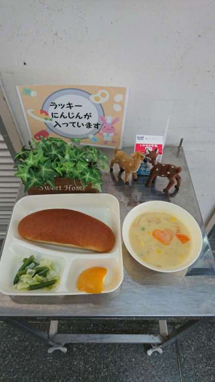 コーンクリームシチュー[米粉]、キャベツと三度豆のサラダ、かき(平たねなし柿)
