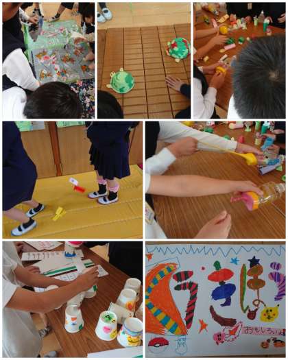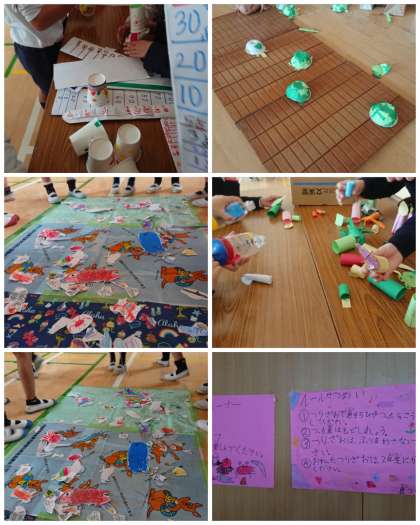生活科で作ったおもちゃを講堂に集めて、「おもちゃランド」を開催しました。お客さんとして、1年生に来てもらったり、校外からも来ていただきました。どのおもちゃコーナーもそれぞれ工夫がなされていて、遊ぶ子どもたちはとても楽しそうでした。