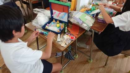 廃材を使ってお店を作り、みんなで並べて商店街にしています。