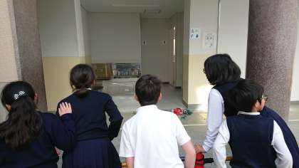 作業板が、外されて中の様子が見えるようになりました。それに気づいた子どもたちがトイレの前に集まって