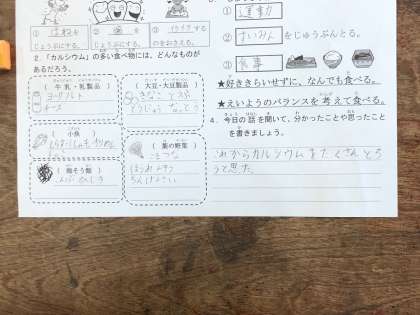 カルシウムが多い食べ物や、丈夫な骨をつくるためには、「運動」「睡眠」「好き嫌いせずに何でも食べること」が大切だと知ることができました。