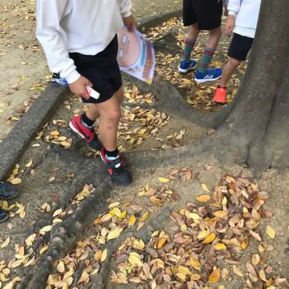 生活科の学習「秋みつけ」で今川公園に行きました。赤や黄色に変わった落ち葉をたくさん集めて、思い思いのおめんを作り、楽しそうな様子でした。