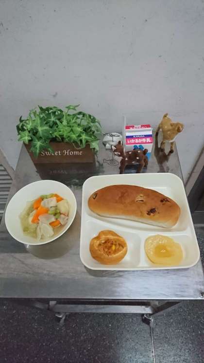 豚肉と野菜のスープ煮、変わりピザ、白桃