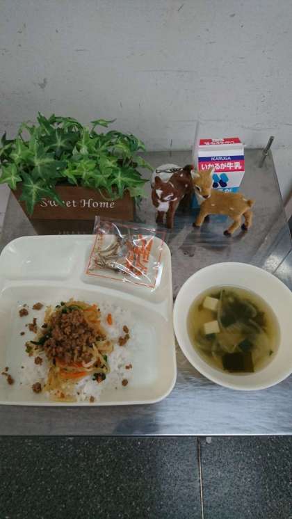 ビビンバ、わかめスープ、アーモンドフィッシュ