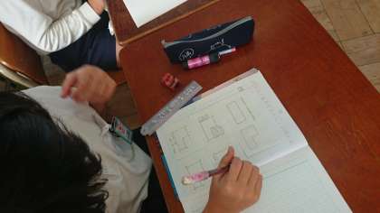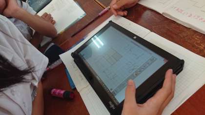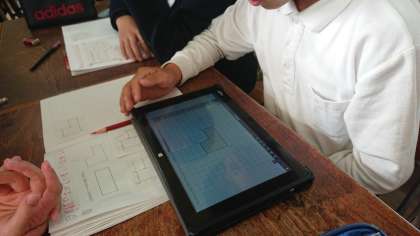 複合図形の面積の求め方を考えました。紙に考えを書き込んだり、デジタル教材を使って考えたりしました。その考えをタブレットを活用して発表しました。