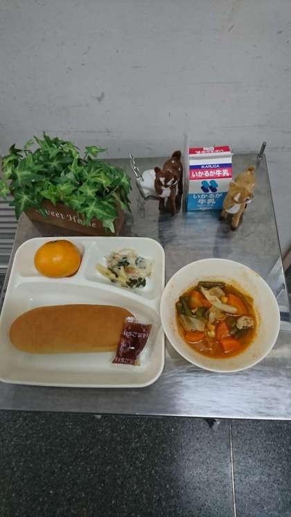 鶏肉と野菜のケチャップ煮、ほうれん草のグラタン、みかん