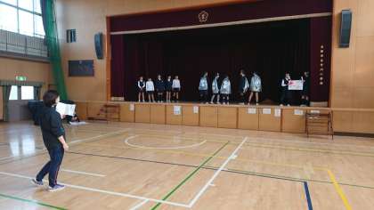 講堂では、劇で挨拶の大切さを全校児童に伝えようと本番の日に向けて練習に取り組んでいます。