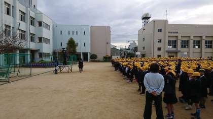 上空に寒気が流れ込み、朝から冷え込む中、児童朝会がありました。