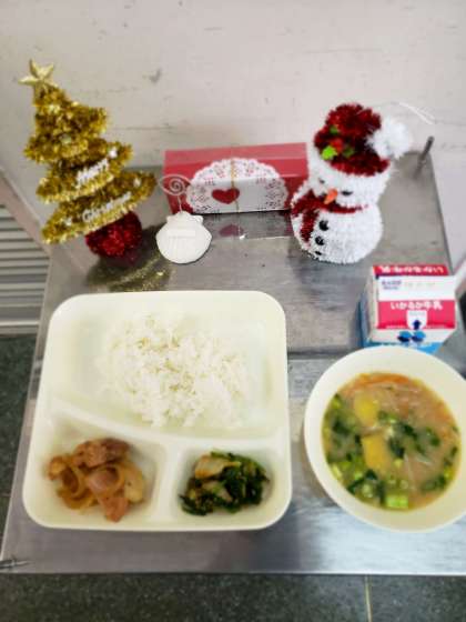 鶏肉の甘辛焼き、みそ汁、きくなとはくさいのごまあえ