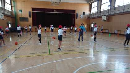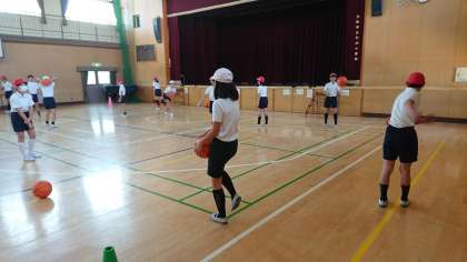 ゴール型のボールゲーム。分かりやすく言うとバスケットボール。目的に応じて、ゲーム中にチェストパス、バウンドパス、オーバーヘッドパスを使い分けれるように、練習に取り組んでいます。