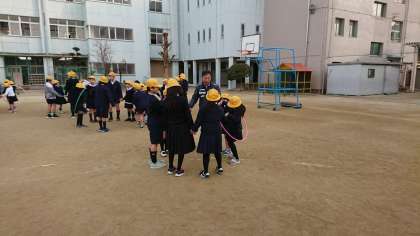 班のみんなで手を繋ぎ、音楽がなっている間、隣の人にフラフープを送っていきます。音楽が止まったときに、フラフープがあるとアウトです。みんなフラフープがくると音楽がなりやむ前に必死になって隣の人に渡していました。寒い中でしたが、みんな十分に体を動かしていたので、いつの間にか寒さが吹っ飛んでいました。