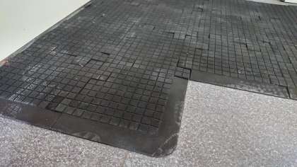 多目的室・PTAルーム・図書室前のマットを新調し、施工しています。色も以前のオレンジからブラックへと変更になり、イメージチェンジです。