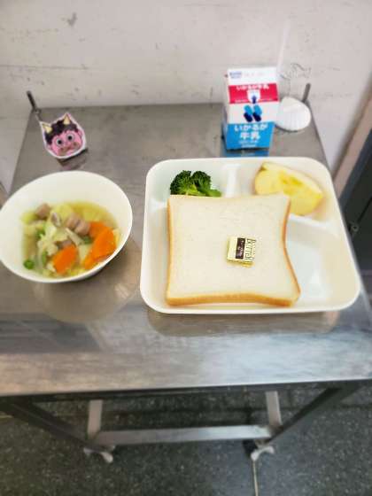 鶏肉と野菜の洋風煮、ブロッコリーのサラダ、りんご