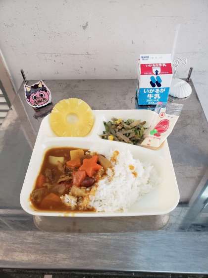 豚肉と金時豆のカレーライス、ごぼうサラダ、パインアップル