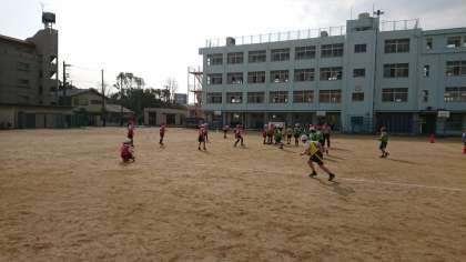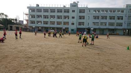 腰の両脇にタグをつけて、ルールを確認しながら、ゲームをしています。タグを取られないように、相手の陣地にボールを持って走り抜けたり、パスをしたりしています。みんな自分の持っている力を発揮しつつ、チームの仲間と協力しながらプレーをしていました。