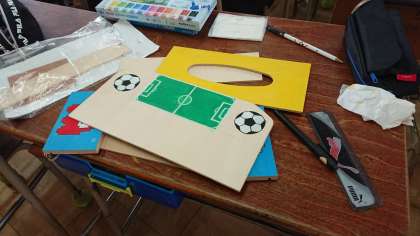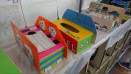 木材を加工して、ティッシュボックスを作成しました。どの子も個性豊かなデザインで作品を仕上げることができました。