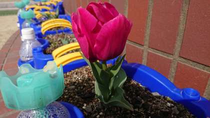 育ててきたチューリップに花が咲き始めました。少し背丈が低い品種の花です。