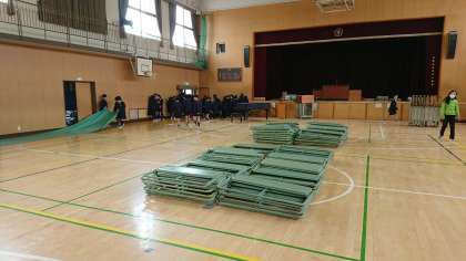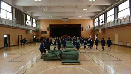 卒業式の準備で、5年生が講堂にシートや椅子を並べました。