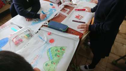 1年間、図工などで作りあげた作品を袋に入れて持ち帰ります。その袋にも、5年生の思い出を絵にして書いています。