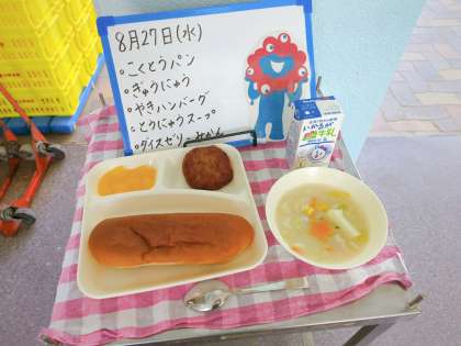 教室では、「ハンバーグおいしい(1年生)」「ハンバーグがふわふわでおいしい(3年生)」「豆乳スープがおいしくて幸せ(2年生)」「今日もゼリーだなんて嬉しすぎる!(3年生)」「ラッキーにんじん入っていたよ(2・3年生)」「暑くて夏バテだけど、しっかり食べました(5年生)」と児童に好評でした。