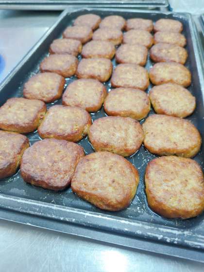 焼きハンバーグは1人60gのハンバーグを焼き物機で焼きました。