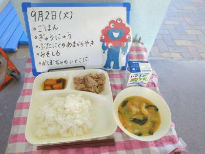 今日の給食は、ごはん、牛乳、豚肉の甘辛焼き、みそ汁、かぼちゃのいとこ煮です。