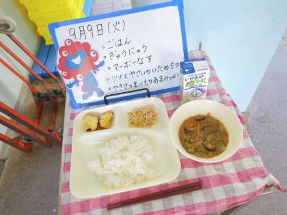 今日の給食は、ごはん、牛乳、マーボーなす、ツナと野菜のいためもの、焼きさつまいもの甘みつかけです。